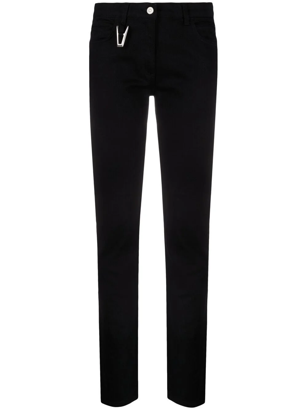 ring-detail slim-fit jeans true black cotton-blend denim ring hardware detailing mid-rise slim cut belt loops zip fly fastening six pockets Made in Italy Composition Cotton 98%, Polyurethane 2% SIZE & FIT Model measurements Height 5 ft 10 in(1.78 m) Bust/Chest 31.49 in(80 cm) Hips 36.22 in(92 cm) Waist 25.59 in(65 cm) FittingInformation This piece fits true to size. We recommend you get your regular size Cut for a slim fit Made with a mid-weight fabric Washing instructions Machine Wash