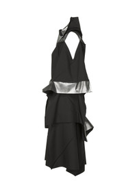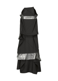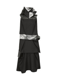 Inspired by daruma block toys, BUILDING BLOCKS FOIL are a three-dimensional series with foil transfer prints applied in square formations. This sleeveless dress has a tiered, A-line shape and a dramatic dimensional neck. Product Code: IL38-FH554 Material: 100% Polyester Care: Hand wash cold. Only non-chlorine bleach, when needed. Do not tumble dry. Line dry in the shade. Cool iron. Dryclean, petroleum solvent only, short cycle.