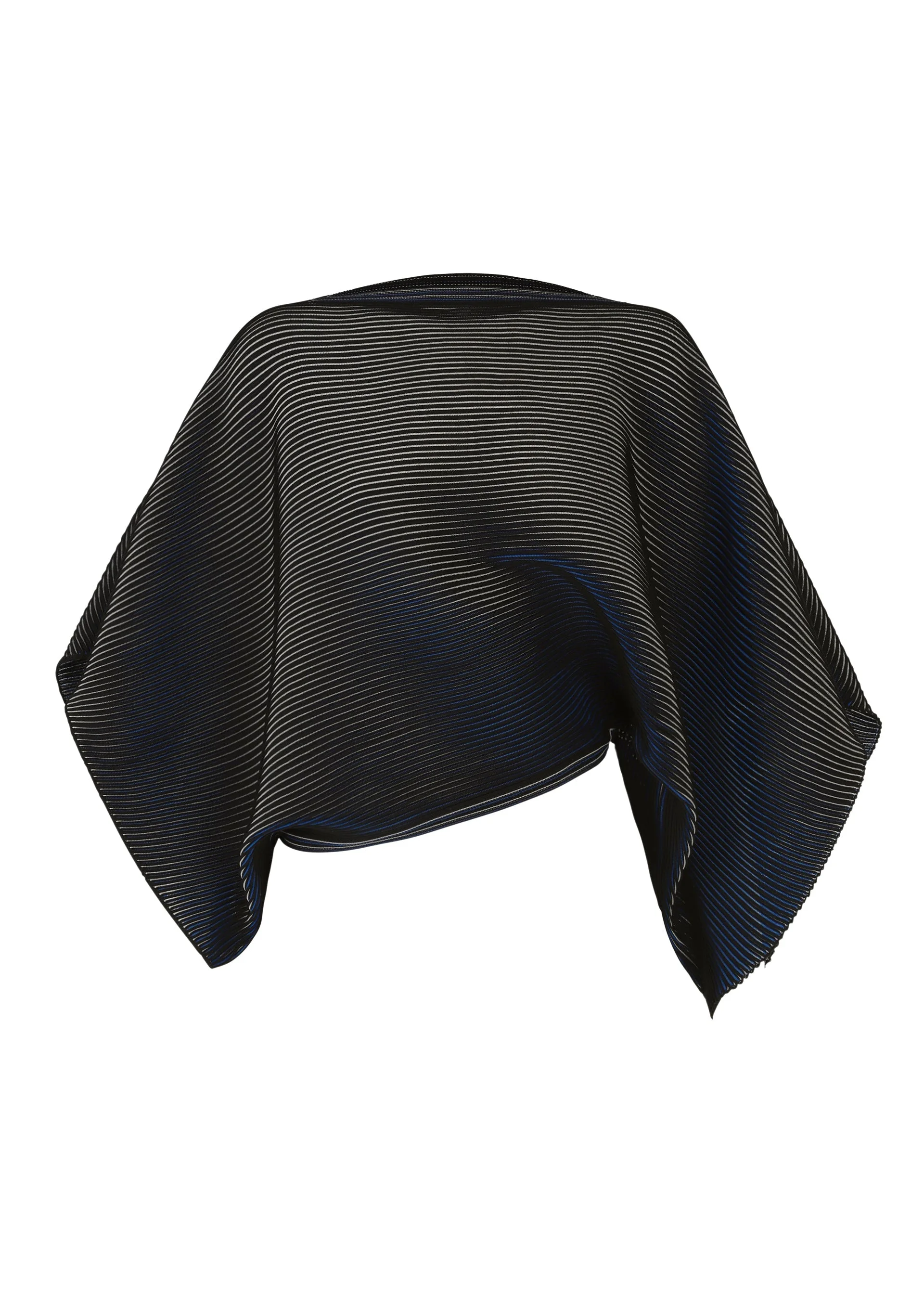 This knit is inspired by the FACET series graphic, which expresses depth through overlapping lines. A special knitting structure that changes color depending on the viewing angle is used to express the pattern depth of the FACET series. Draping is formed when you put on the knit with its simple quadrilateral shape, creating a further visual effect. Product Information Material: 98% Polyester, 1% Nylon, 1% Polyurethane Made In Japan Neckline / collar:Boat neck
