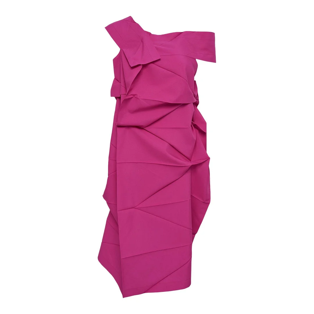 600069352PNK003 / IL58FH503/00/23/JUL - Mathematical pleating technology construction - Three-dimensional sculptural silhouette - Lightweight polyester fabric - Asymmetrical off-shoulder design - Origami-inspired geometric folds - Transformative structured shape The 132 5. ISSEY MIYAKE No.2 Woven Dress delivers innovative three-dimensional design through the brand's revolutionary mathematical pleating system. Crafted from lightweight polyester in vibrant magenta, featuring the signature origami-inspired construction that transforms from flat fabric to sculptural form. The engineered pleats create dynamic movement and architectural silhouette that adapts to the wearer's body.