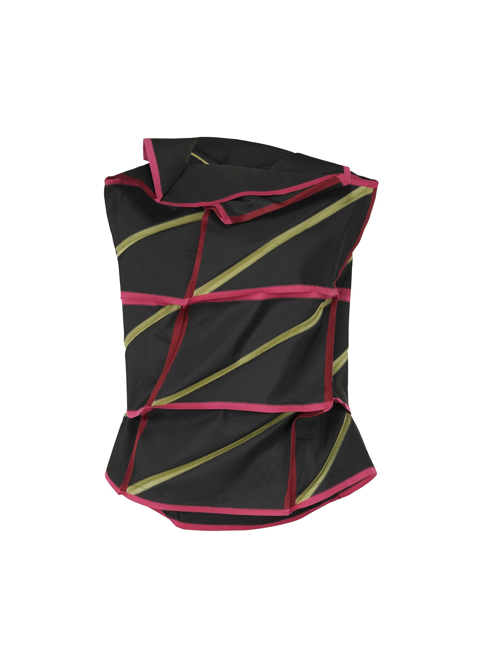 This top is based on the fold structure "NO. 5," which connects a series of same-size parallelograms to form a spiral-shaped quadrangular column when made three-dimensional. The top is characterized by its jacquard-woven pattern along each parallelogram that serves as a fold line.