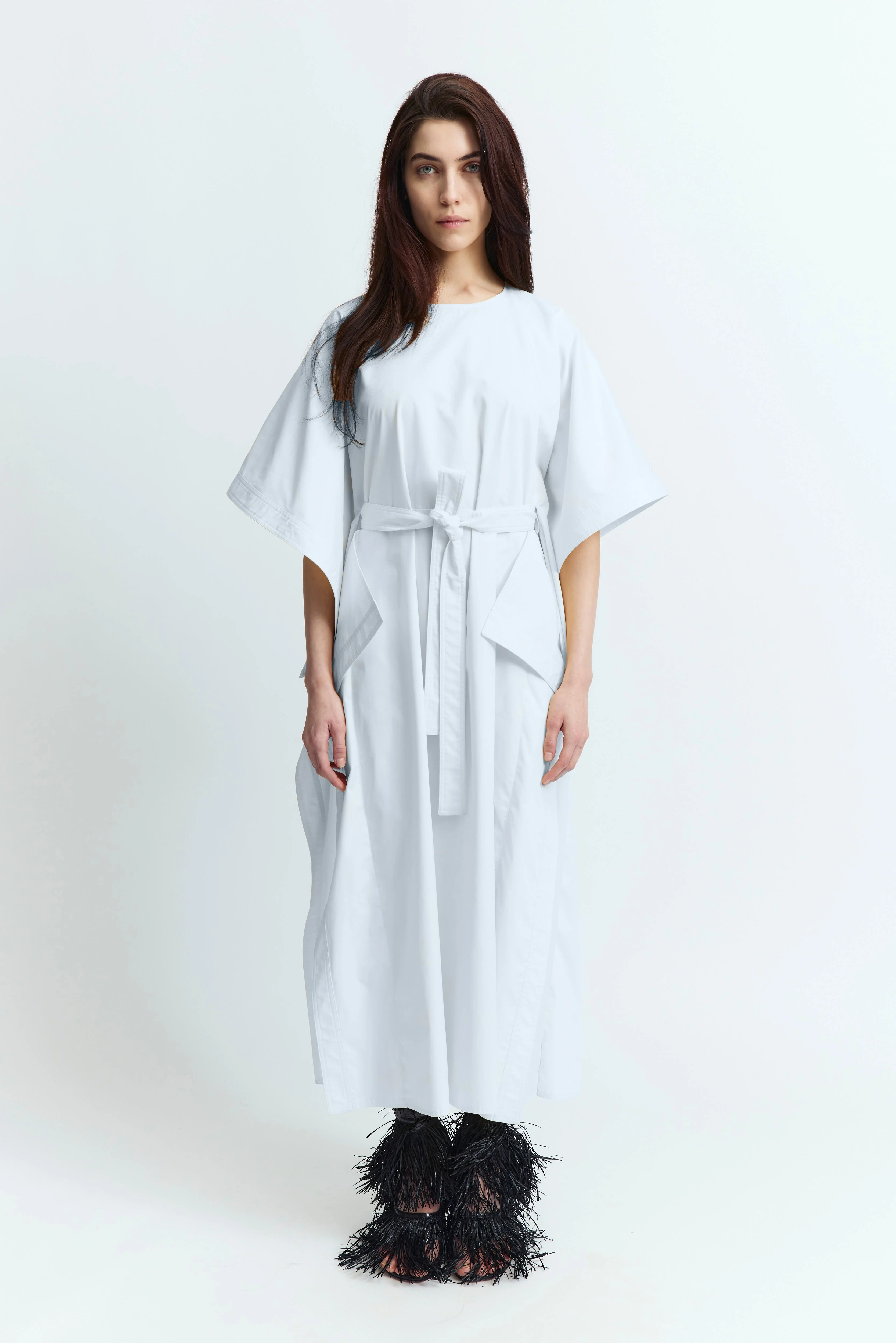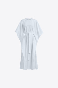 The Achi Dress in white is a cape style dress that includes a belt to accentuate the waist. It is designed to fit loosely to the body and has fabric flowing on the arms to create a cascading effect. This dress is fastened at the back with a button and it falls below the knees. MORE DETAILS Designed for a relaxed fit. The model is 5'9.5" (176cm) and wears a S. - Outer: Cotton 100% - Lining: Cotton 100% - Care: Machine wash or dry clean - Made in Portugal Style number: D-MD-601-SS25-01