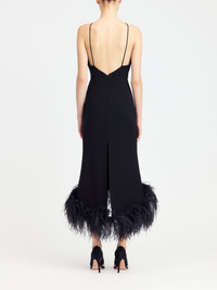 The Ade dress is made from deep black crepe, structured yet soft against the body. The fitted bodice features a cross-strap halter neckline and a low-cut back. From the waist, a narrow trumpet skirt falls to a midi length, dipping lower at the front and extending longer at the back, finished with a plush feather trim that flows softly as you move. MORE DETAILS Designed for a regular fit. The model is 5'11" (180cm) and wears a UK 8. - Composition: Main: 100% Polyester, Lining: 100% Recycled Polyester, Trim: 100% Ostritch Feather - Care: Professional Dry Clean Only - Made in GREAT BRITAIN. Style number: D-MD-701-SS26-01