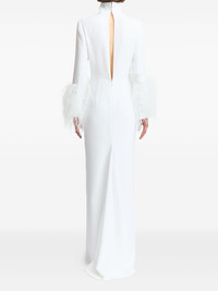Arios feather-trim gown Highlights - White - High neck - Long sleeves - Feather trim to the cuffs - Back zip fastening - Back slit Made in United Kingdom Composition Outer: Polyester 100% Lining: Recycled Polyester 100% Trims: Ostrich Feather 100%, Feather 100% Body: Fabric 100% Washing instructions Dry Clean Only