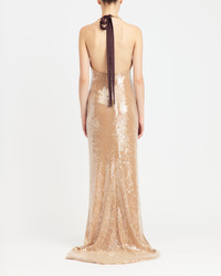 The Auden gown is cut from sheer nude sequin, fitted throughout in a sleek silhouette. The square neckline is framed by halter straps that tie at the back with dark chocolate satin ribbons. The floor-length skirt follows a sheath line and extends into a puddle train for a refined, elongating effect. MORE DETAILS Designed for a slim fit. The model is 5'11" (180cm) and wears a UK 8. - Composition: Main:100% Polyester, Lining: 85% Nylon 15% Spandex - Care: Professional Dry Clean Only - Made in GREAT BRITAIN. Style number: G-124-SS26-02