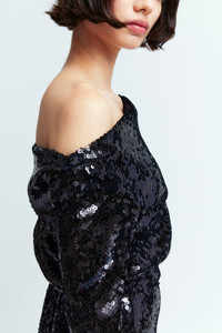 The Lano Mini Dress is a one shoulder, long sleeve sequin midi dress. It features a zip along the side and is entirely covered in black sequins. The one shoulder element gives the dress an asymmetrical neckline and it is designed to fit closely to the body. This dress is also available as a midi dress as the Danae Midi Dress MORE DETAILS Designed for a regular fit. The model is 5'10.5" (178cm) and wears a UK 8. - Outer: 100% Polyester - Lining: 100% Recycled Polyester - Care: Hand wash only - Made in Portugal Style number: D-522-SS25-1