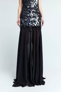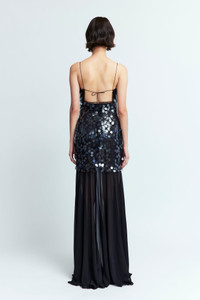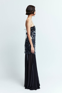 The Salia Gown in black is a floor-length dress with thin straps that tie at the low-cut back. The bodice features grey paillette sequins embroidered on sheer mesh, creating a scaled effect. A gathered georgette skirt flows effortlessly, contrasting with the fitted, sequin-embroidered bodice for a dynamic silhouette. MORE DETAILS Designed for a regular fit. The model is 5'10.5" (178cm) and wears a UK8. Outer: 100% Polyester Care: Hand wash only Made in Portugal Style number: G-069-SS25-1