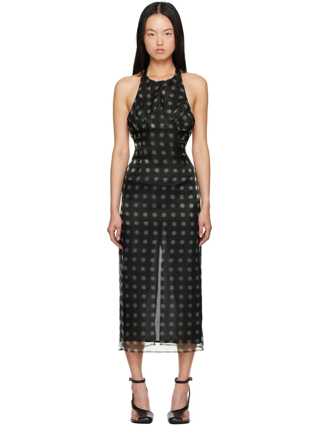 Semi-sheer polyester organza midi dress. Polka dot pattern printed throughout. · Round neck · Gathering at chest · Button fastening at halter strap · Zip closure at open back · Central vent at back hem · Full georgette lining Supplier color: Verde 100% polyester. Made in United Kingdom 242427F054010