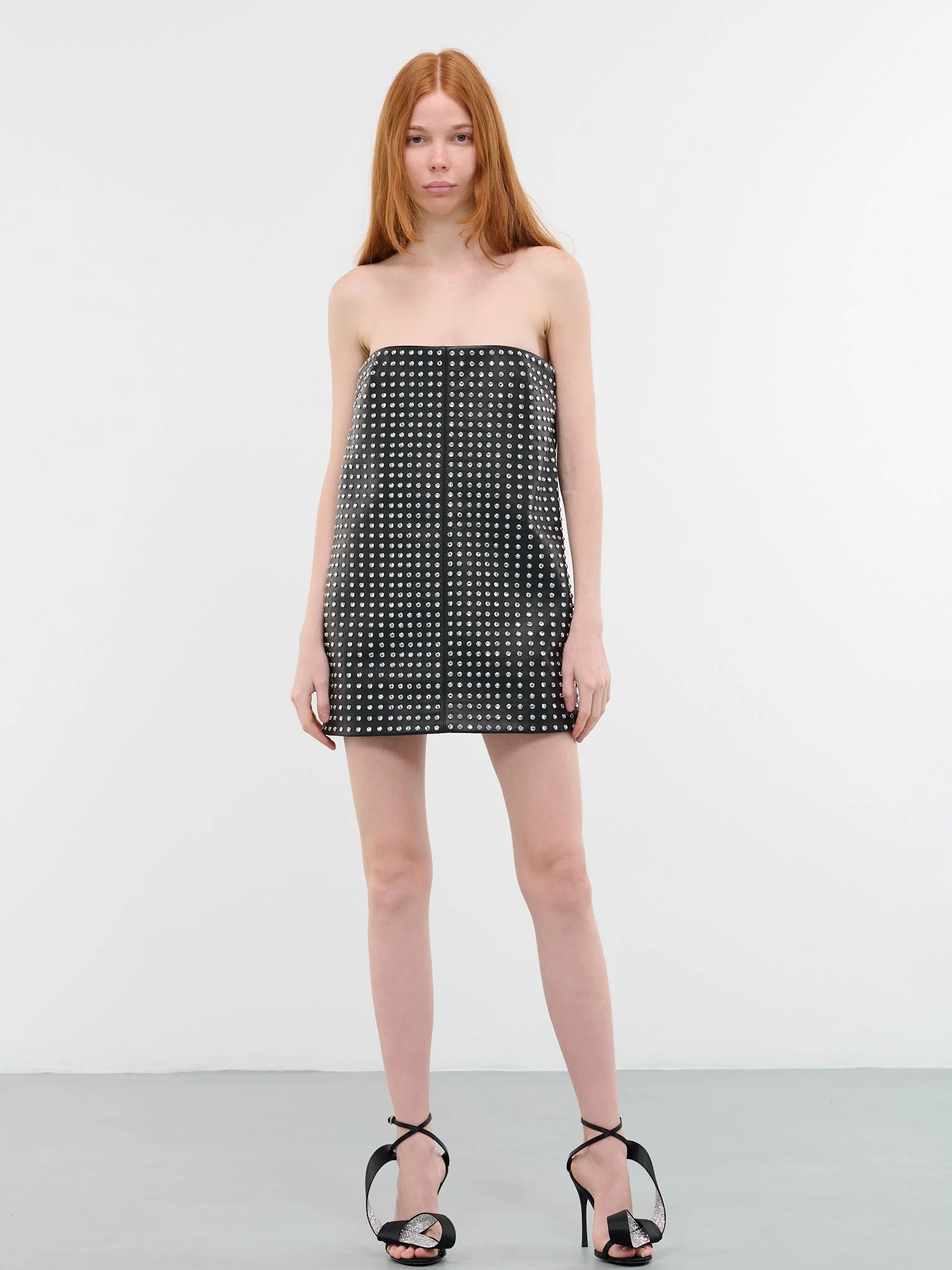 16ARLINGTON dress in black, leather construction, crystal studded grid pattern, strapless, bodice top, side seam pockets & zip closure, hook & eye fastening, mini length, slim fit. UK Sizing 100% Leather Model is 5'9" wearing size 8. Bust: 31.5" Waist: 23" Hips: 34"
