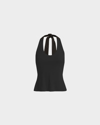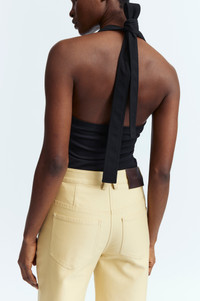 The Bridgetta Top in black is cut from signature jersey for a slim-fitting silhouette. It features a racer neckline that extends into long ribbons, which can be tied at the back for a custom fit. MORE DETAILS Designed for a slim fit. The model is 5'9.5" (176cm) and wears a UK 8. - Main: 97% Viscose 3% Elastane - Contrast: 100% Polyester - Care: Machine Wash Cold or Dry Clean - Made in Portugal Style number: T-370-AW25-HS-C-01