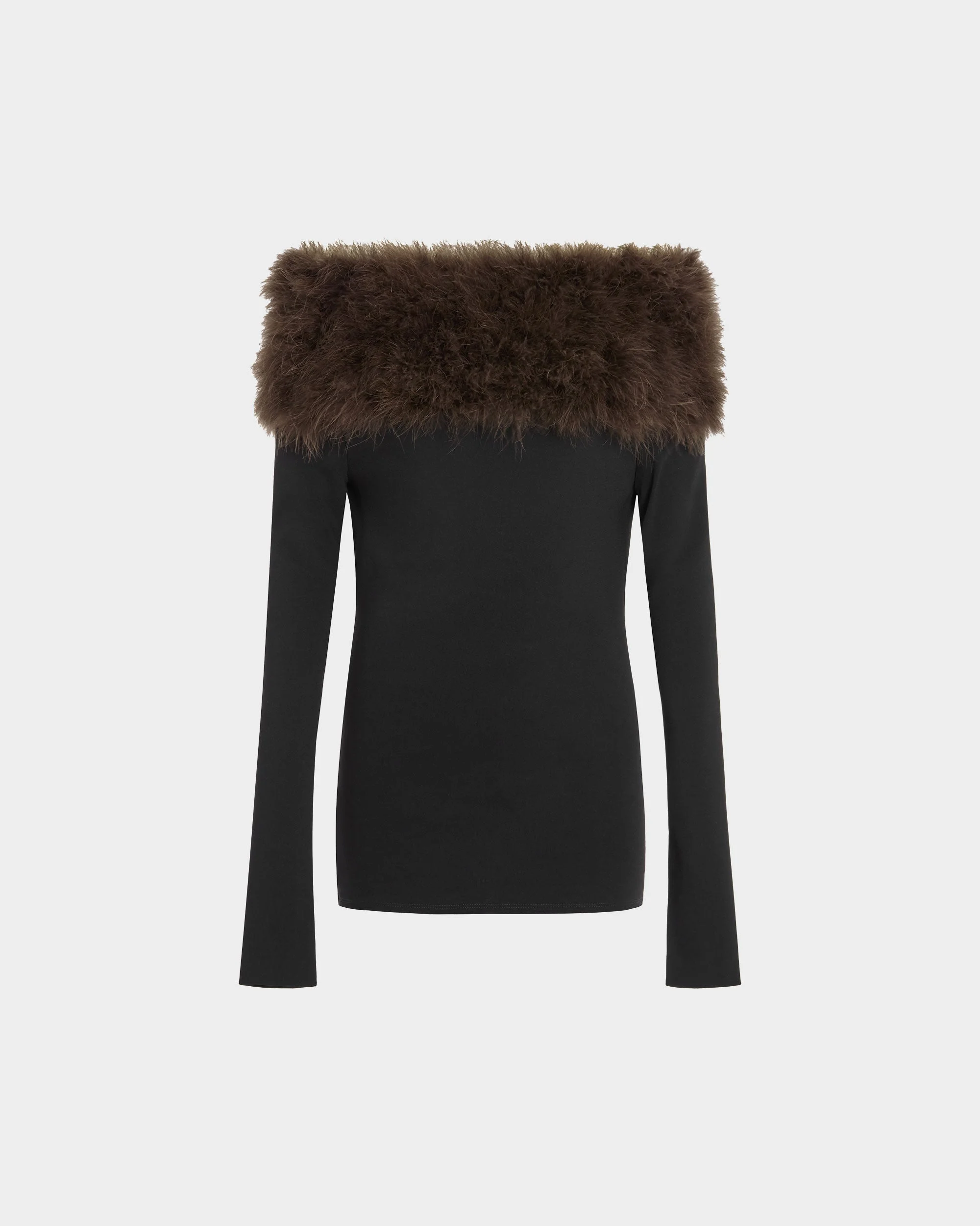 The Canter top is cut from black Punto Milano with a clean, sculpting finish, fitted throughout in a sleek, slimline silhouette. It features a fitted bodice and long sleeves with subtle cuff slits. The off-shoulder neckline is framed by a wide panel of dark chocolate marabou feathers, introducing soft texture to the structured form. MORE DETAILS Designed for a slim fit. The model is 5'10" (178cm) and wears a UK 8. - Composition: Main: 67% Viscose 28% Polyamide 5% Elastane, Trim: 100% Turkey Feather - Care: Professional Dry Clean Only - Made in GREAT BRITAIN. Style number: T-311-SS26-01