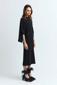 The Catius Dress is a mid-length design made from signature lightweight jersey, offering a close fit while allowing movement and flow. It features a cape-like sleeve and an open back, tied at the nape with a ribbon finished with a double-stitched border. Catius Dress in black was featured as Look 32 in the Spring Summer 2025 runway show and is also availablwe in yellow. MORE DETAILS Designed for a slim fit. The model is 5'11" (180cm) and wears a UK 8. Outer: Viscose 97% Elastane 3% Care: Cool wash or dry clean Made in Portugal Style number: D-MD-572-SS25-01