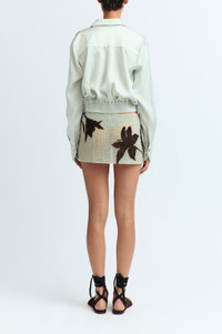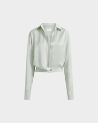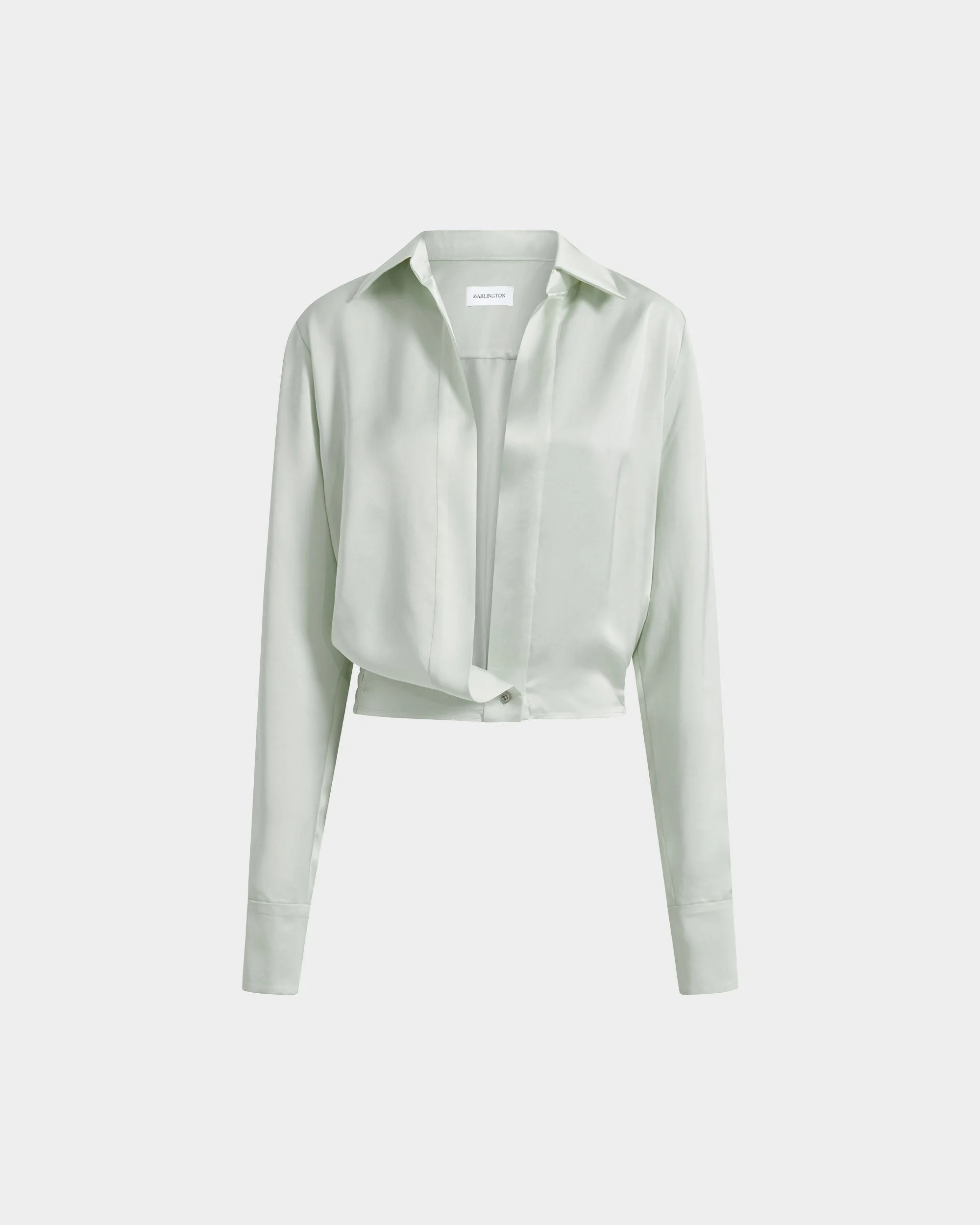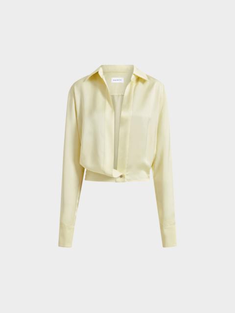 The Cosette Shirt is a deep-plunge collared design with full buttoning along the front. It features a folded detail at the waist, mimicking the look of a tucked-in shirt. With long sleeves and a loose, draped fit, it is cut from lustrous satin in misty pale blue and is also available in yellow. MORE DETAILS Designed for a relaxed fit. The model is 5'11" (180cm) and wears a UK 8. - Outer: Polyester 100% - Lining: Recycled Polyester 100% - Care: Hand wash or dry clean - Made in Portugal Style number: T-382-SS25-03