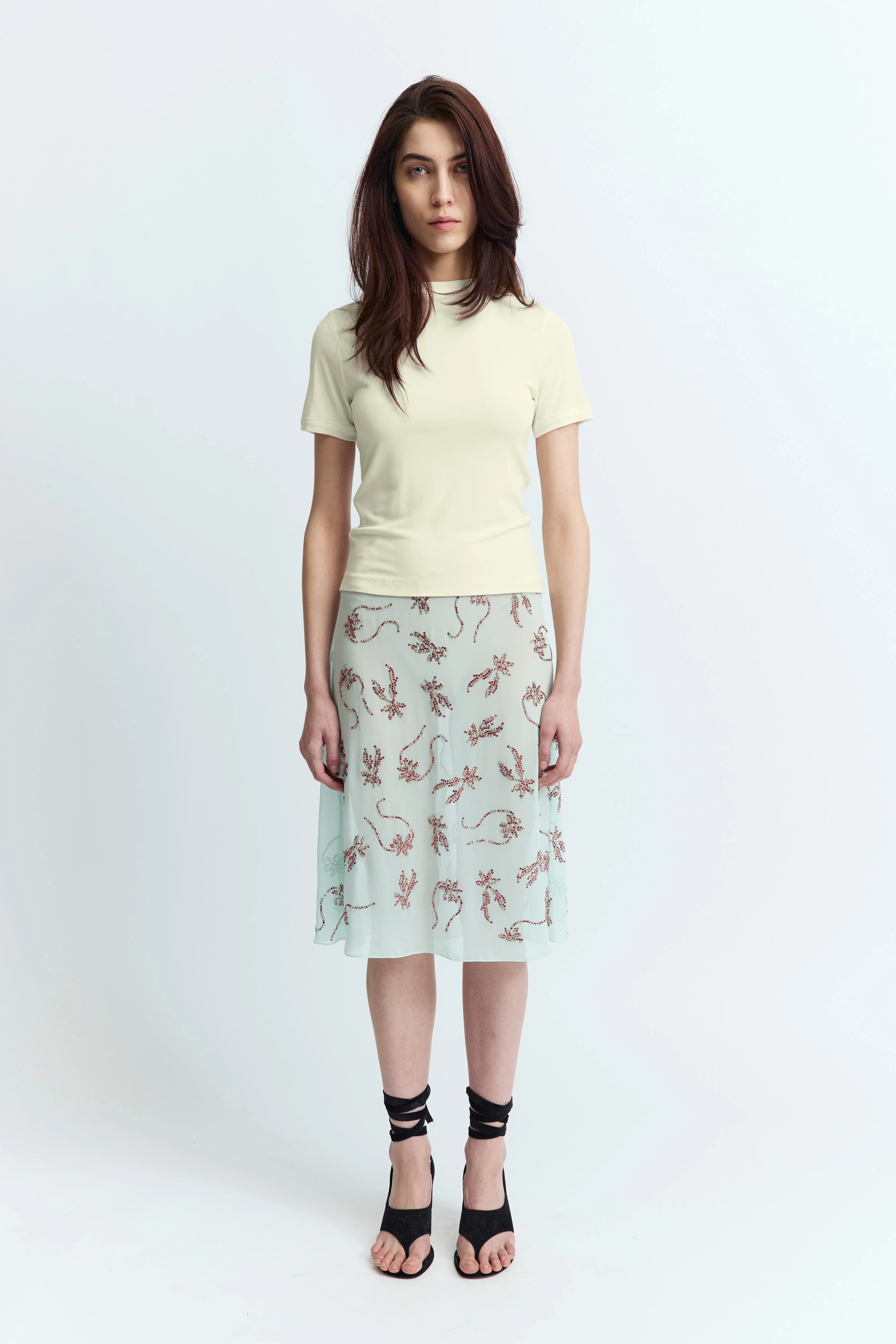 The Dafne Skirt in pale blue is a midi-length design cut from flowing georgette fabric, featuring a custom floral pattern with rose-colored crystal hotfix detailing. Falling below the knees, it has a loose, fluid fit and fastens at the back with a concealed zip. MORE DETAILS Designed for a regular fit. The model is 5'9.5" (176cm) and wears a UK 8. - Outer: Polyester 100% - Lining: Recycled Polyester 100% - Care: Specialist Leather Dry Cleaning Only - Made in United Kingdom Style number: S-MD-155-SS25-02