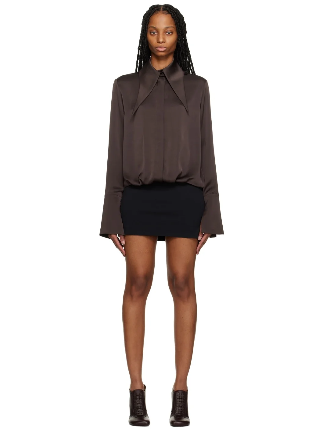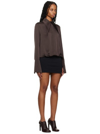 Polyester satin and stretch viscose-blend jersey dress. · Modified spread collar · Button closure · Gathering at waist · Vented cuffs · Box pleat at back yoke Part of the SSENSE exclusive Work Capsule. Supplier color: Chocolate brown/Black Body 1: 100% polyester. Body 2: 64% viscose, 33% polyamide, 3% polyurethane. Made in United Kingdom 231427F052005
