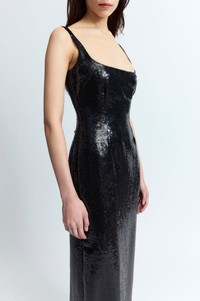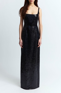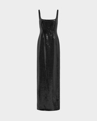 The Electra Gown in black is a signature 16Arlington silhouette with all-over sequin embellishments. Designed for a slim fit, it features a square neckline with thin shoulder straps and falls to the floor for an elongated, refined look. MORE DETAILS Designed for a slim fit. The model is 5'9.5" (176cm) and wears a UK 8 - Composition: 100% Polyester - Care: Specialist Dry Cleaning Only - Made in Portugal Style number: G-046-AW25-HS-C-01