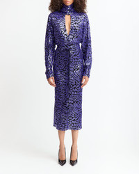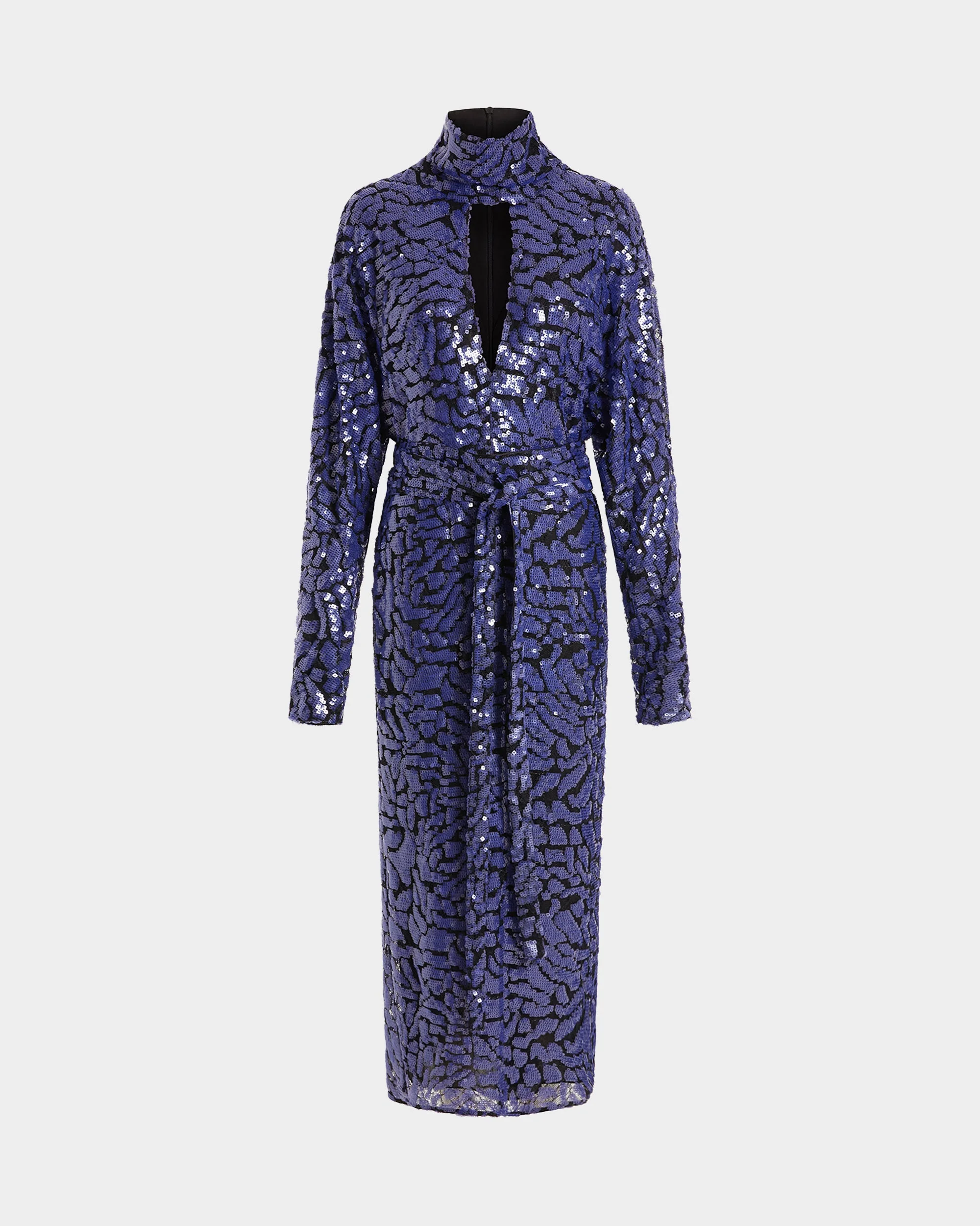 Epole Midi Dress features a purple sequin pattern layered over a black lace base, creating depth and subtle shimmer. Designed with long sleeves, a high neckline and a front keyhole cut-out, it includes a matching belt to define the waist. A back split introduces movement to the mid-length hem. MORE DETAILS Designed for a slim fit. The model is 5'10" (178cm) and wears a UK 8 - Main: 100% Polyester - Lining: 100% Recycled Polyester - Care: Dry cleaning only, iron a low temperature - Made in Great Britain Style number: D-MD-674-AW25-01