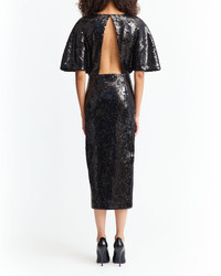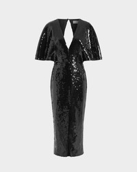 The Ermara Midi Dress in flat sequin features a deep V-neckline and structured batwing sleeves that create soft volume through the upper body. A centre-front split adds movement to the clean midi length, while a triangular cut-out at the back adds a touch of sharpness. MORE DETAILS Designed for a slim fit. The model is 5'10" (178cm) and wears a UK 8 - Main: 100% Polyester - Lining: 100% Recycled Polyester - Care: Dry cleaning only, iron a low temperature - Made in Great Britain Style number: D-MD-673-AW25-01