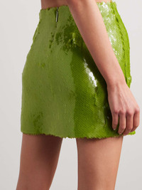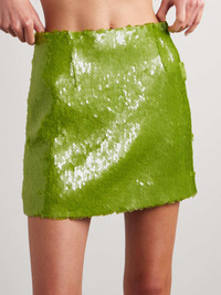 EDITORS'NOTES 16ARLINGTON's 'Este' mini skirt is the perfect combination of minimalism and maximalism. Made from tulle in a simple A-line shape, it's covered in green sequins that reflect the light prettily from all angles. It's fully lined in crepe de chine to ensure a smooth feel. Wear yours with a tucked-in sweater and heels. SIZE & FIT Model measurements: - Fits true to size, take your normal size - Mini-length, designed to be worn at the waist - Particularly short in length - Mid-weight, heavily embellished, non-stretchy fabric - Model is 177cm/ 5'10" and is wearing a UK 8 - Bust: 79cm/ 31" - Waist: 61cm/ 24" - Hip: 85cm/ 33.5" DETAILS & CARE - Sage-green tulle - Concealed zip fastening along back - 100% polyester; lining: 100% recycled polyester - Dry clean - Designer color: Linden