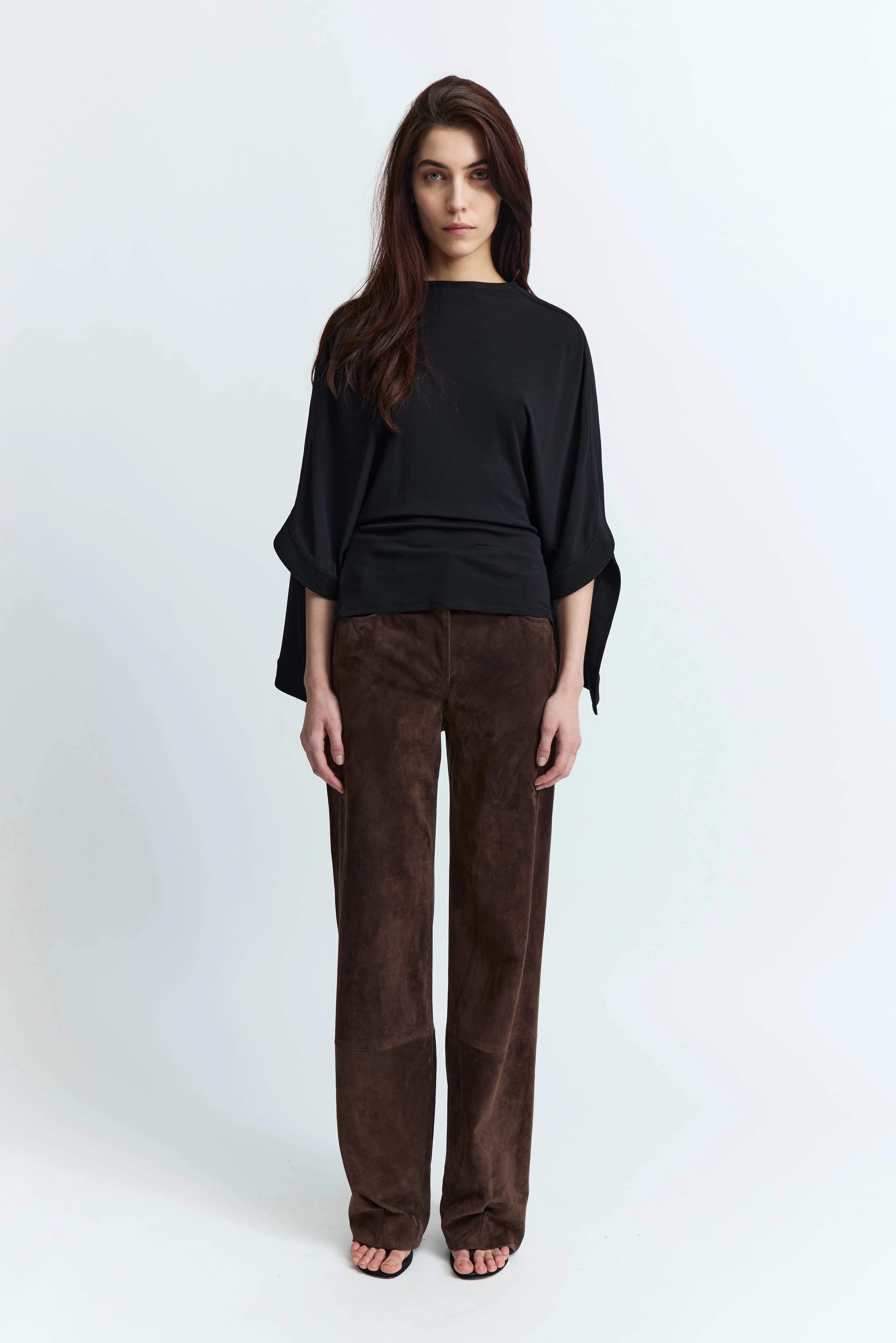 The Fale Top in black features cape-style sleeves and a backless design, secured at the nape with a tie finished with double-stitched borders. Cut from signature lightweight jersey, it is designed for a close fit. MORE DETAILS Designed for a relaxed fit. The model is 5'11" (180cm) and wears a UK 8. - Outer: Viscose 97% - Lining: Elastane 3% - Care: Cool wash or dry clean - Made in Portugal Style number: T-341-SS25-01