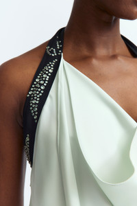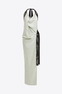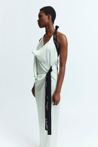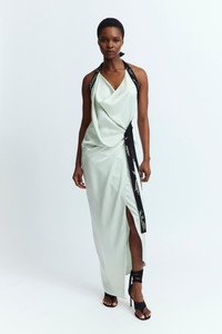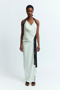 The Fiama Gown in pale blue is a floor-length draped cowl-neck dress in lustrous satin that ties at the back of the neck with a contrast strap adorned with custom crystal hotfix applique. It features gathered detailing at the side of the waist and is cut for a close fit. MORE DETAILS Designed for a regular fit. The model is 5'9.5" (176cm) and wears a UK 8. - Outer: Polyester 100% - Lining: Recycled Polyester 100% - Care: Specialist Dry Cleaning Only - Made in Portugal Style number: G-085-SS25-02