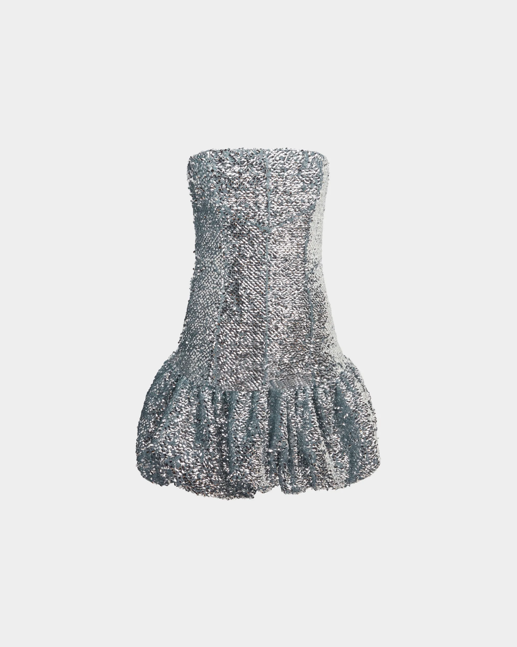 The Garance Mini Dress is a refined party silhouette crafted from textured sequin fabric with a soft, luminous finish. Strapless and form-fitting through the bodice, it flares into a sculptural bubble peplum skirt, bringing a playful yet elevated twist to classic eveningwear. MORE DETAILS Designed for a slim fit. The model is 5'10" (178cm) and wears a UK 8. - Main: 100% Polyester - Lining: 100% Recycled Polyester - Care: Professional dry clean only - Made in Portugal. Style number: D-MN-636-AW25-02