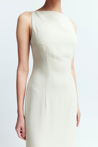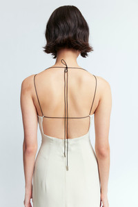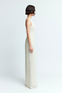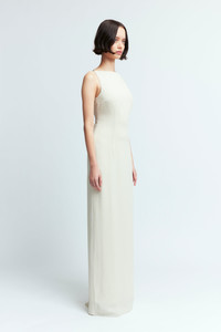 The Hebe Gown in off white is a floor-length design crafted from smooth crepe fabric, offering a figure-hugging silhouette. It features a high neckline, sleeveless shoulders, and delicate, thin straps that fasten at the open back for an adjustable fit. The straight hem is finished with a back split for ease of movement. MORE DETAILS Designed for a regular fit. The model is 5'10.5" (178cm) and wears a UK 8. Outer: 100% Polyester Care: Cool wash or Dry clean Made in Portugal Style number: G-071-SS25-3