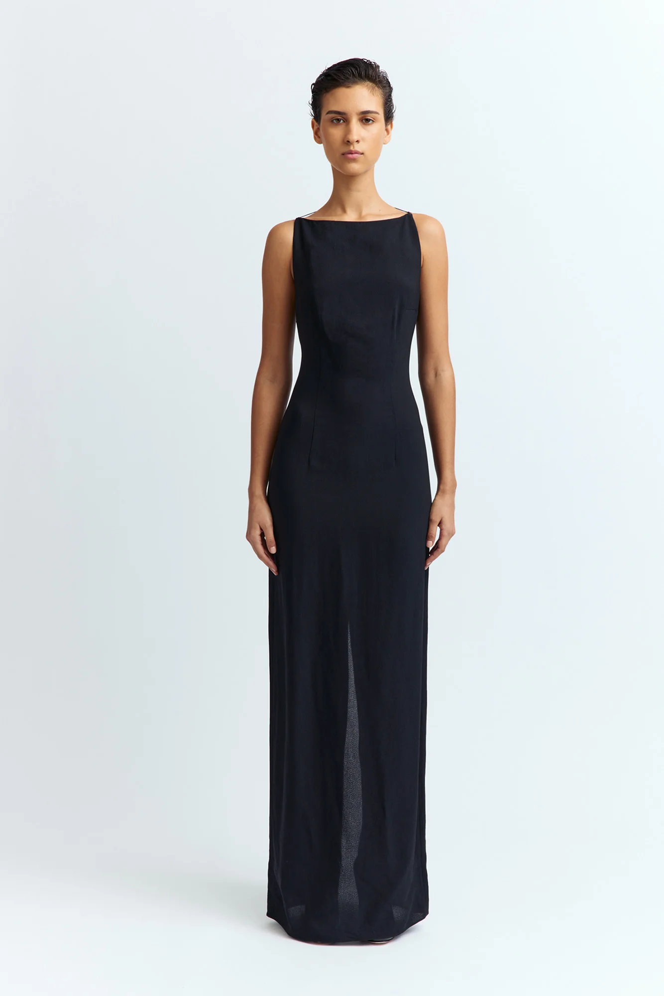 The Hebe Gown in black is a floor-length design crafted from smooth crepe fabric, offering a figure-hugging silhouette. It features a high neckline, sleeveless shoulders, and delicate, thin straps that fasten at the open back for an adjustable fit. The straight hem is finished with a back split for ease of movement. MORE DETAILS Designed for a regular fit. The model is 5'11" (180cm) and wears a UK 8. - Outer: 100% Polyester - Lining: 100% Recycled Polyester - Care: Cool wash or Dry clean - Made in Portugal Style number: G-071-SS25-2