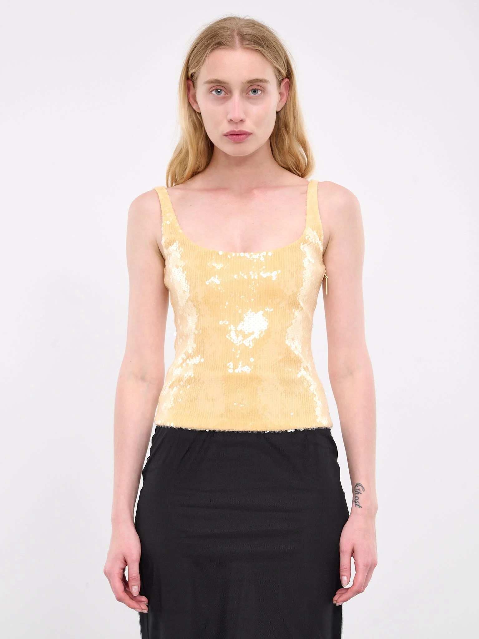 16ARLINGTON tank in yellow, paneled sequin construction, scoop neck, spaghetti straps, sleeveless, armscyes, side zip closure, straight hem, lined, slim fit. Imported Outer: 95% Polyester 5% Spandex Inner: 88% Polyester 12% Spandex UK Sizing Model is 5'8" wearing size 6. Bust: 31" Waist: 23.5" Hips: 34"