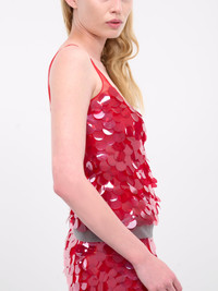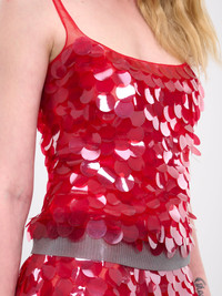 16ARLINGTON tank in red, paneled mesh construction, all-over sequin embellishment, semi-sheer, scoop neck, spaghetti straps, sleeveless, armscyes, straight hem, slim fit. Made in India Outer: 100% Nylon Contrast: 100% Polyurethane UK Sizing Model is 5'8" wearing size 8. Bust: 31" Waist: 23.5" Hips: 34"