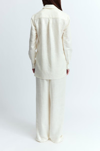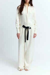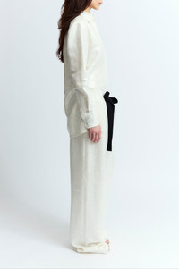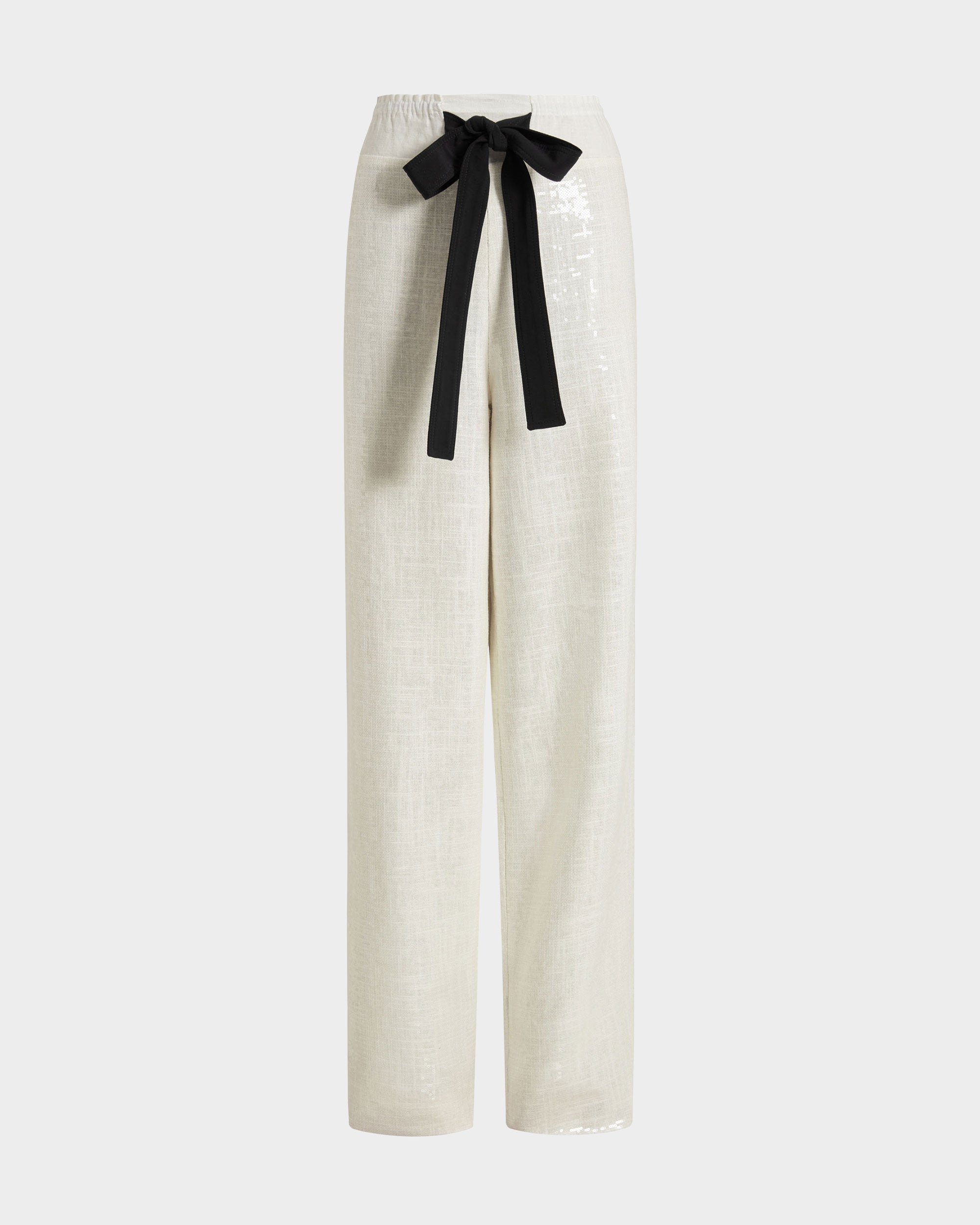 The Ima Trouser in white is a relaxed pyjama-style design cut from lightweight linen with sequin embellishments throughout. It features a contrast linen yoke, a gathered elasticated waistband, and a black ribbon tie at the front. Sitting at the hips, the trousers fall to the floor for a laid-back yet elevated finish. Complete the look with a matching Marley shirt. MORE DETAILS Designed for a relaxed fit. The model is 5'9.5" (176cm) and wears a UK 8. - Composition: 100% Polyester - Care: Specialist Dry Cleaning Only. - Made in Portugal. Style number: TR-106-AW25-HS-C-02