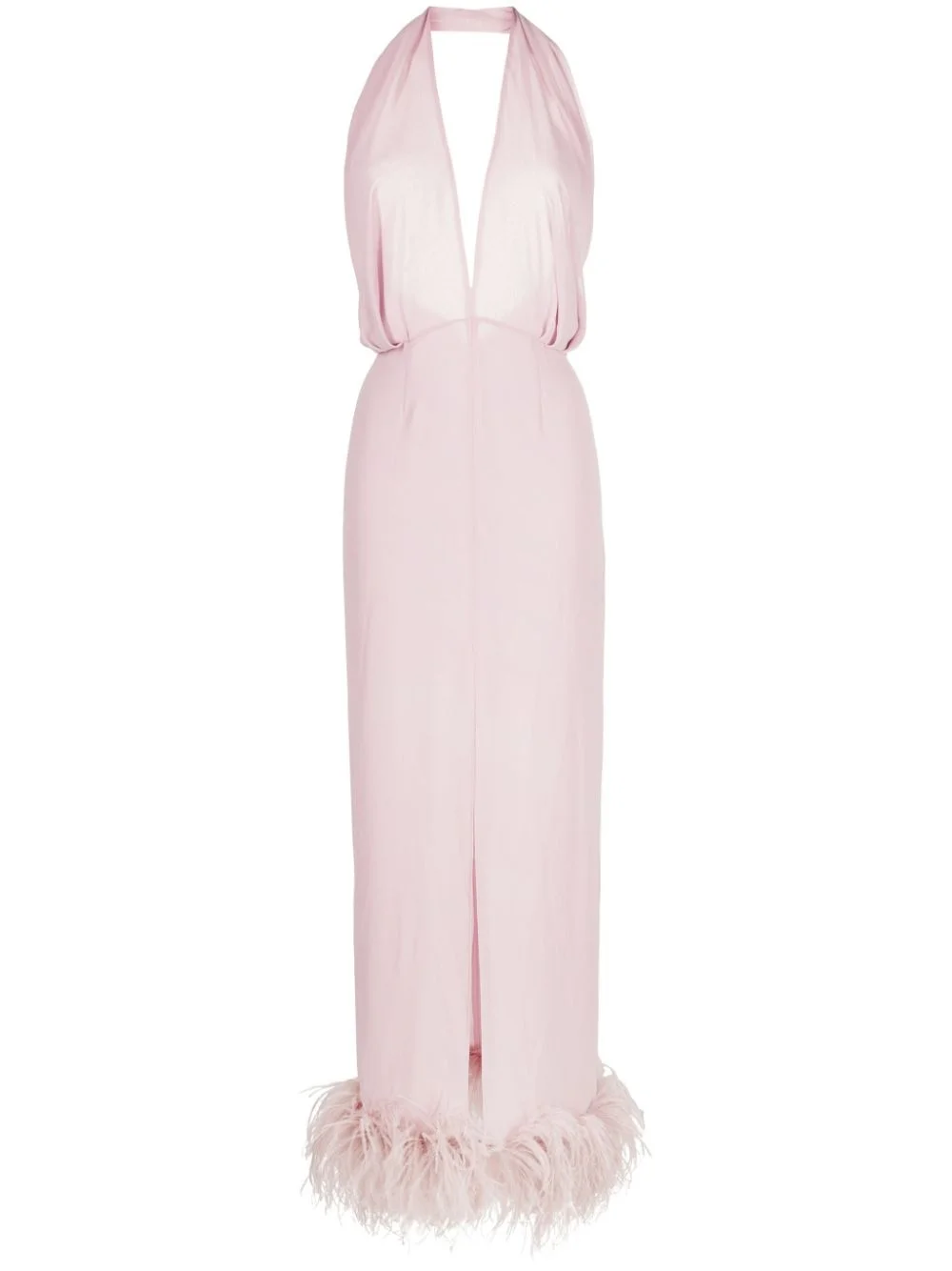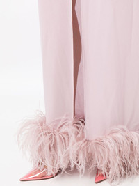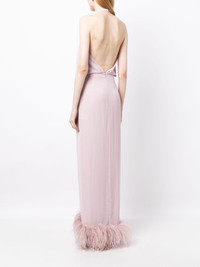 Isolde feather-trim halterneck dress Highlights - Mauve - Ostrich feather - Feather-trim detailing - Plunging v-neck - Halterneck - Backless - Rear zip fastening - Fitted waistline - Floor-length - This piece features very delicate detailing. handle with extreme care to avoid damage such as broken feathers or loss of sequins. Made in United Kingdom Composition Polyester 100%, Ostrich Feather 100% SIZE & FIT Model measurements Height 5 ft 10 in(1.78 m) Bust/Chest 29.13 in(74 cm) Hips 35.43 in(90 cm) Waist 23.62 in(60 cm) FittingInformation Designed for a loose fit at the chest with a close fit over the waist and hips Particularly long in length; consider your own measurements Made from a midweight non-stretch fabric This piece fits true to size – take your usual size Washing instructions Dry Clean Only