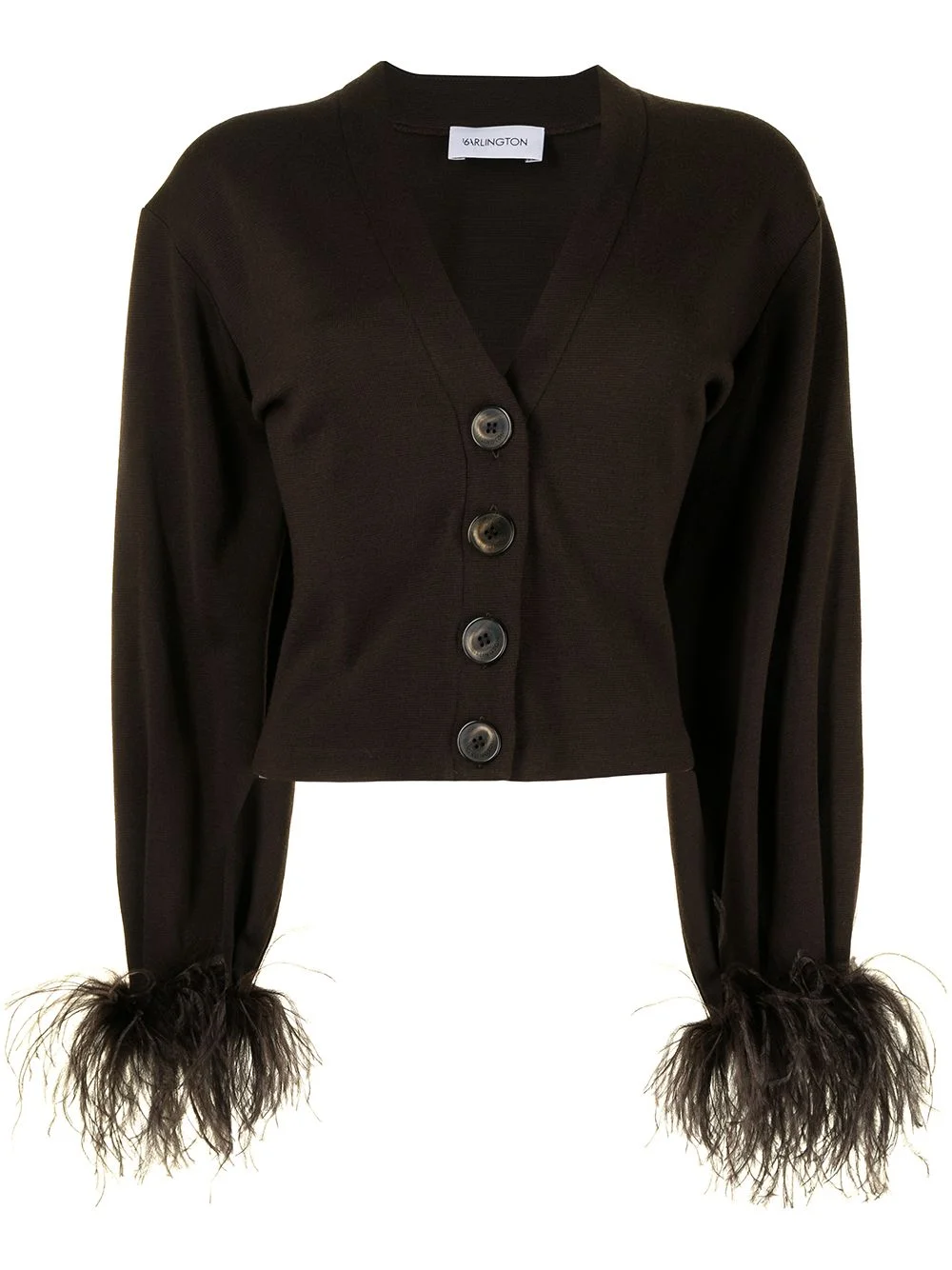 Kara feather-trim cardigan fondant brown virgin wool blend feather-trim detailing V-neck front button fastening long sleeves straight hem Made in United Kingdom Composition Virgin Wool 50%, Acrylic 50% Washing instructions Dry Clean Only