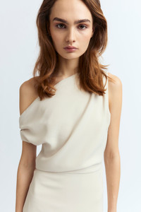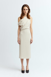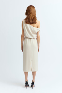 The Kira Midi Dress in off-white features a one-shoulder design with an asymmetrical neckline. The bodice has subtle ruching that flows into a slim-fitting, straight-line skirt that falls below the knee. Crafted from crepe fabric, it offers a sleek and refined silhouette. MORE DETAILS Designed for a regular fit. The model is 5'11" (180cm) and wears a UK 8. - Outer: 100% Polyester - Lining: 100% Recycled Polyester - Care: Cool wash or Dry clean - Made in Portugal Style number: D-535-SS25-2