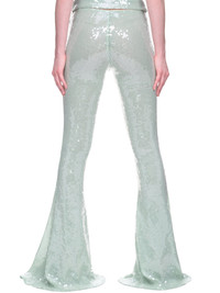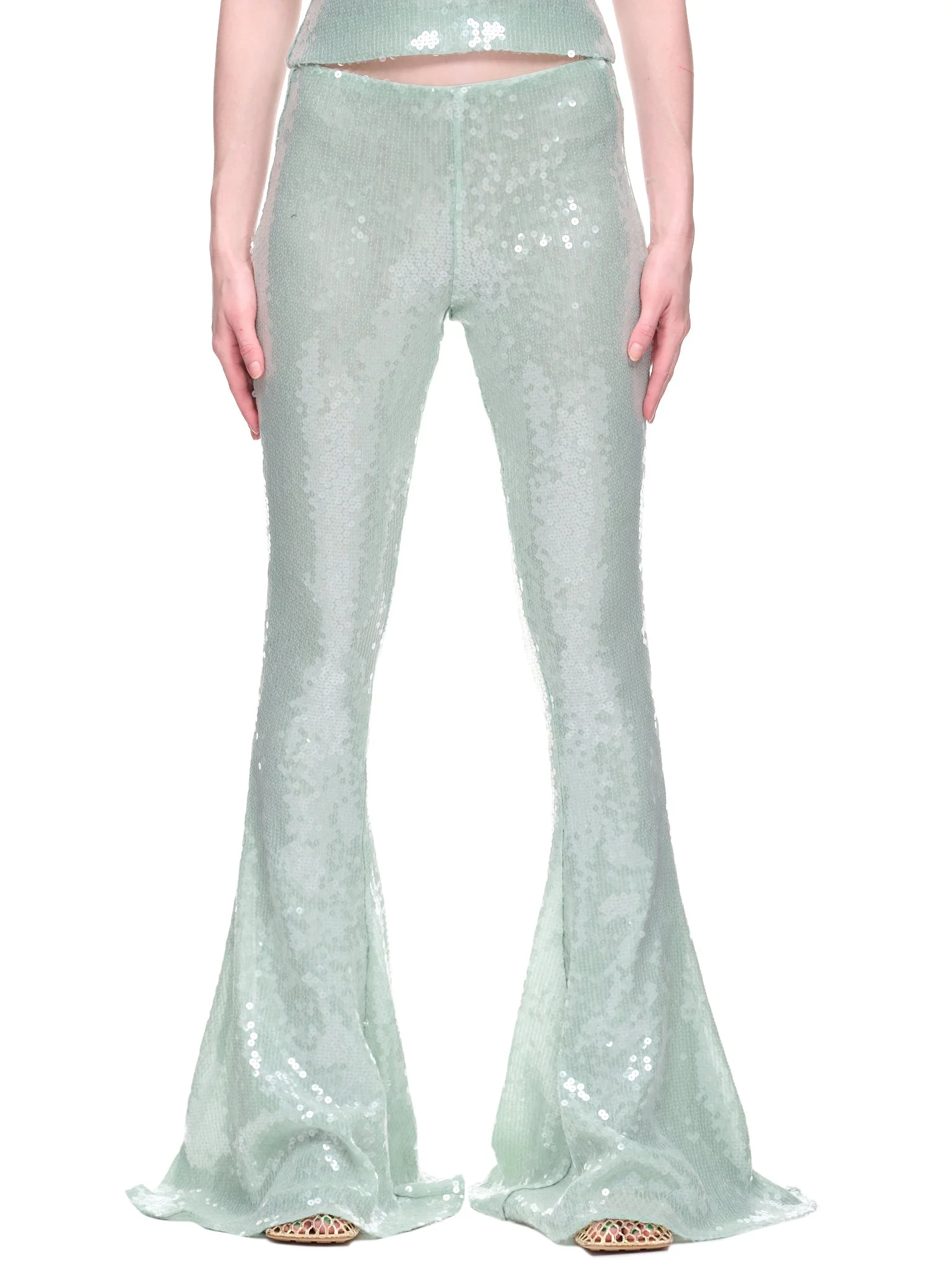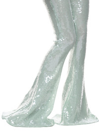 16ARLINGTON pants in teal, shiny sequin, mid-waist, side zip fastening, slight stretch, flared leg, fitted. Made in UK UK Sizing Composition: 95% Nylon, 5% Spandex Model is 5'7" and is wearing size 8. Bust: 32" Waist: 25" Hip: 37"