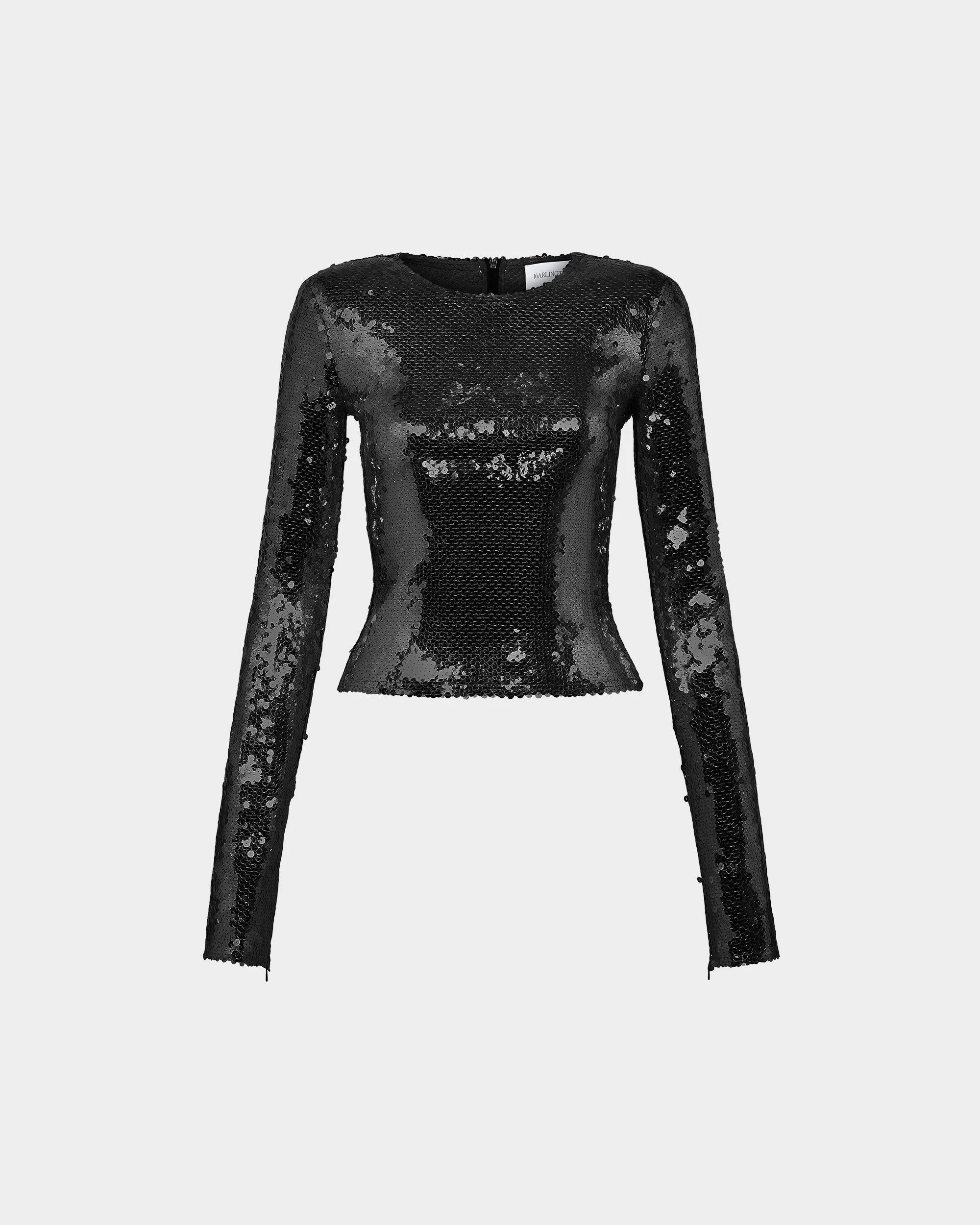 The Loida Top is cut from shimmering flat sequin in a close-fitting silhouette that contours the body. Built-in shoulder pads define the structure, creating a strong, angular line through the shoulders. A concealed back zip maintains the streamlined shape, emphasizing its sharp, sculptural finish. MORE DETAILS Designed for a slim fit. The model is 5'10" (178cm) and wears a UK 8. - Main: 100% Polyester - Lining: 100% Recycled Polyester - Care: Professional dry clean only - Made in Portugal. Style number: T-395-AW25-01