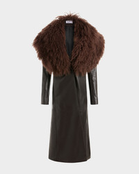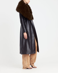 The Luisa coat is cut from buttery-soft dark chocolate leather that molds smoothly to the body. Its fitted bodice closes with a single, clean button, opening into an A-line silhouette that flares from the waist. The leather is supple with a subtle sheen that deepens the richness of the colour. At the neckline, an exaggerated Mongolian shearling collar brings a hit of subversive drama. Soft, full, and unmistakably tactile, it can be detached for a sharper, more minimal finish. Two moods, one coat – both grounded in precise construction and a deliberate sense of ease. MORE DETAILS Designed for a slim fit. The model is 5'11" (180cm) and wears a UK 8. - Composition: Main: 100% Lambskin, Collar: 100% Lamb Shearling, Lining: 100% Viscose - Care: Professional Leather Clean Only - Made in GREAT BRITAIN. Style number: C-084-SS26-01 LEATHER NOCCIOLA
