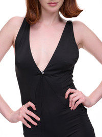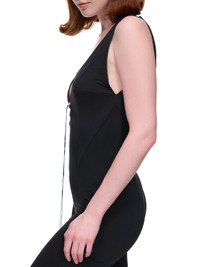16ARLINGTON jumpsuit in black, v-neckline with adjustable tie detail, metal hardware, back zip fastening, long flared leg, fitted. Made in UK UK Sizing Model is 5'7" and is wearing size 8. Bust: 32" Waist: 25" Hip: 37"