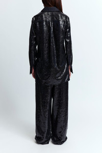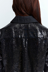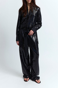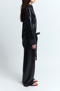 The Marley Shirt in black is a relaxed pyjama-style silhouette, cut from lightweight linen with sequin embellishment throughout. It features a contrast linen collar and cuffs, a concealed button closure, and pleats at the centre back. Wear with matching Ima trousers for a complete look. MORE DETAILS Designed for a relaxed fit. The model is 5'9.5" (176cm) and wears a UK 8. - Composition: Main: 100% Polyester, Contrast: 100% Linen - Care: Specialist Dry Cleaning Only - Made in Portugal Style number: T-307-AW25-HS-C
