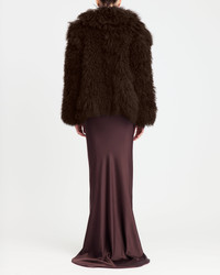 The Maryam jacket is cut from dark chocolate Mongolian shearling in a slightly cropped silhouette that falls to the hips. It features long sleeves and an exaggerated collar, combining tactile richness with a subtly defined shape. MORE DETAILS Designed for an oversized fit. The model is 5'11" (180cm) and wears a S. - Composition: Main: 100% Lamb Shearling, Contrast: 100% Lambskin, Lining: 100% Viscose - Care: Professional Leather Clean Only - Made in GREAT BRITAIN. Style number: J-132-SS26-02