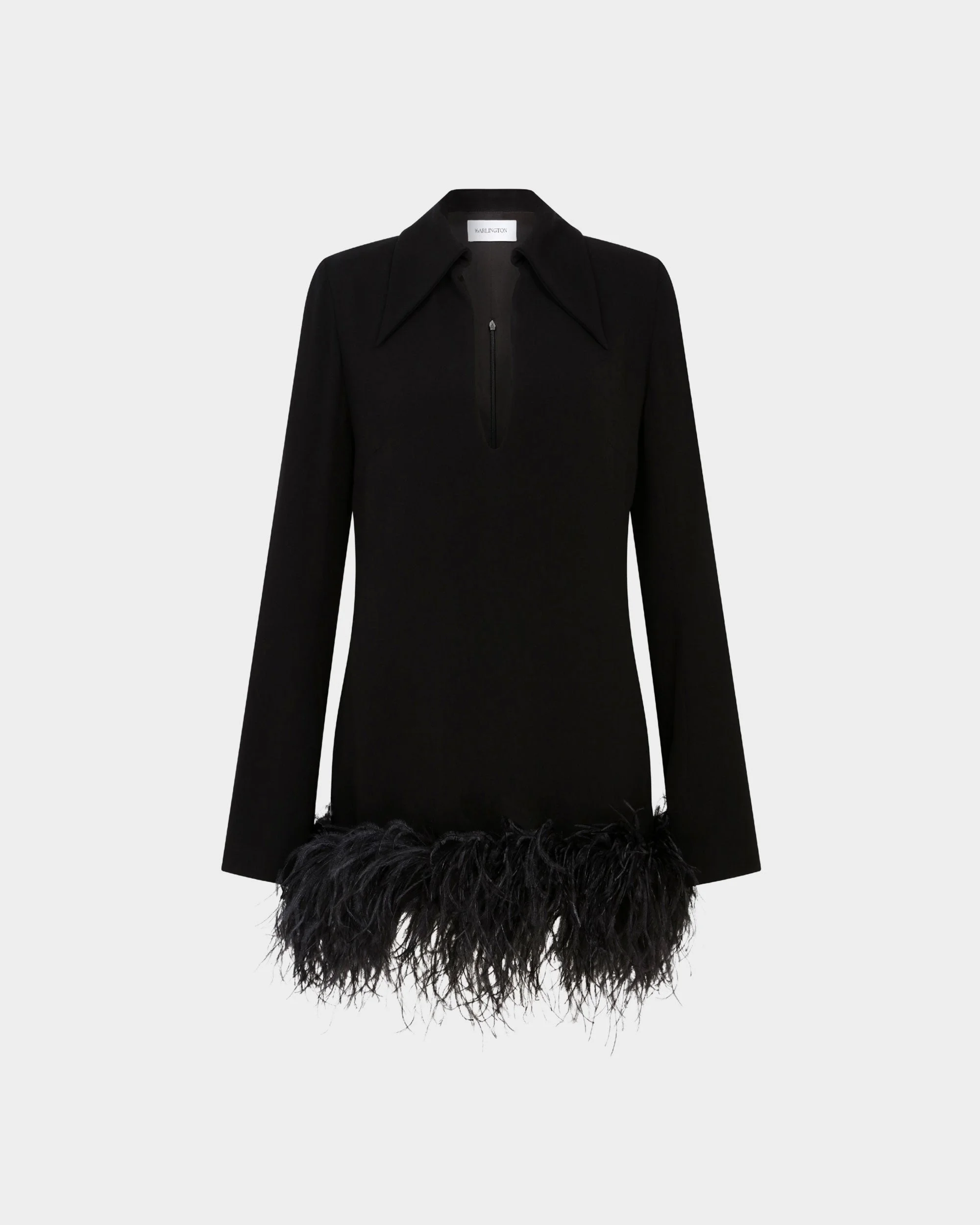 The Michele Mini Dress is a tailored design in smooth crepe, defined by an exaggerated collar and a narrow plunge split at the chest. Mini in length with long sleeves, it finishes with a feathered hem that adds movement and contrast to its sharp lines. MORE DETAILS Designed for a regular fit. The model is 5'11" (180cm) and wears a UK 8. - Main: 100% Polyester - Lining: 100% Recycled Polyester - Trim: 100% Ostrich Feather - Care: Professional dry clean only - Made in Portugal. Style number: D-MN-647-AW25-01