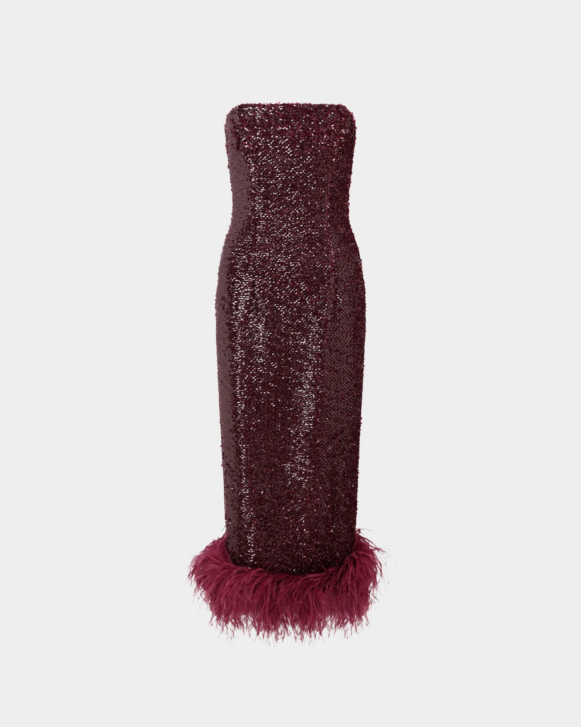 The Minelli Midi Dress is a strapless, fitted design crafted from rich burgundy textured sequin. Structured with an internal corset for a sculpted silhouette, it features a feathered hem that brings dynamic movement and a tactile contrast to the shimmering finish. MORE DETAILS Designed for a slim fit. The model is 5'10" (178cm) and wears a UK 8. - Main: 100% Polyester - Lining: 100% Recycled Polyester - Trim: 100% Ostrich Feather - Care: Professional dry clean only - Made in Portugal. Style number: D-MD-648-AW25-02