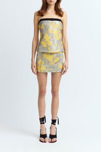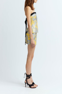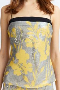 The Mione Top is a spaghetti-strap camisole with a low-cut back, crafted from floral sequin fabric and featuring a custom hotfix crystal design. A contrasting ribbon along the neckline fastens at the back, adding a refined detail. Designed for a close fit, it falls to the hips for a sleek silhouette. MORE DETAILS Designed for a slim fit. The model is 5'11" (180cm) and wears a UK 8. - Outer: Polyester 100% - Lining: Recycled Polyester 100% - Care: Specialist Dry Cleaning Only - Made in Portugal Style number: T-372-SS25-01