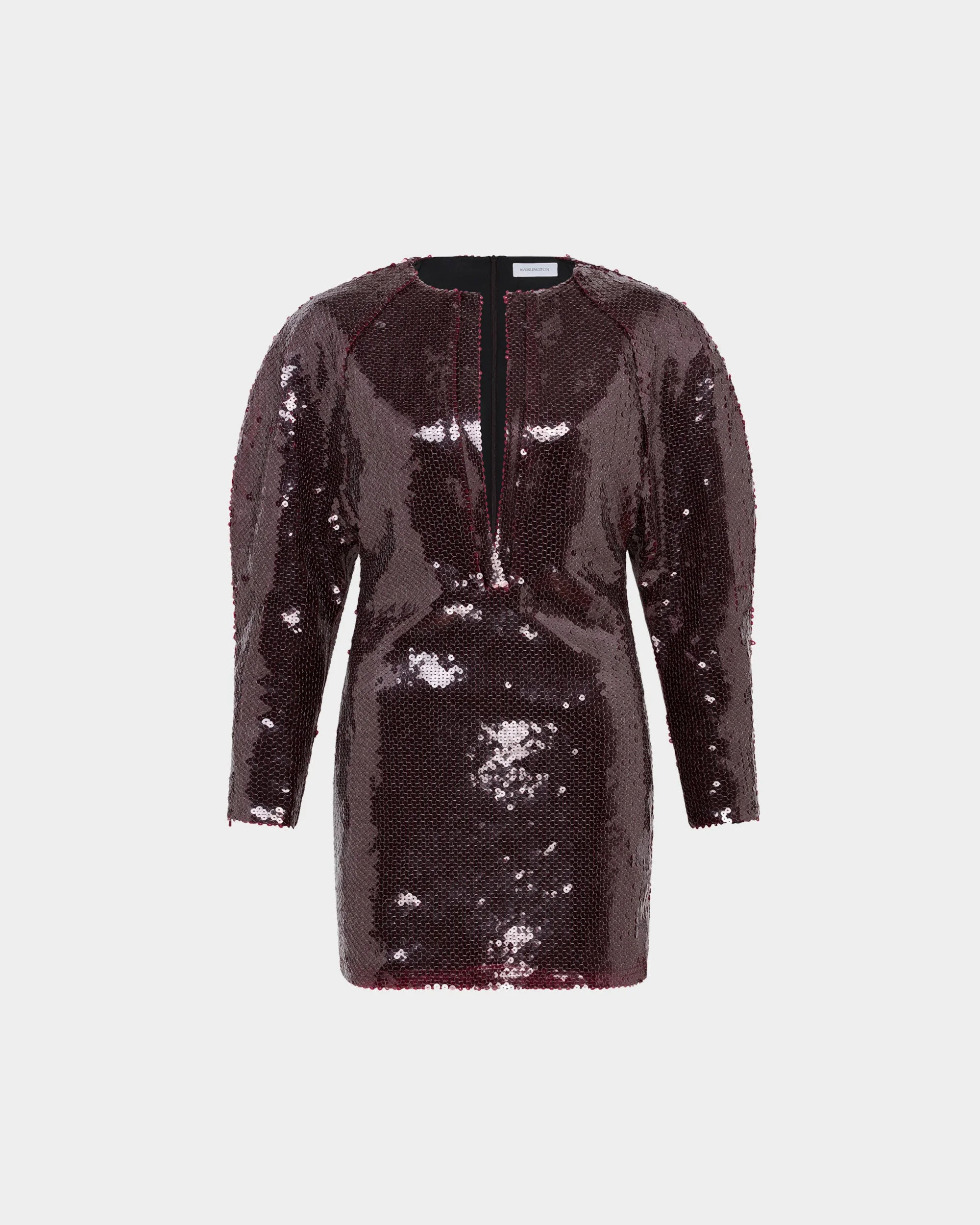 The Mitilla Mini Dress is a striking, long sleeved silhouette in deep burgundy sequins, designed to catch the light with subtle intensity. It features a narrow plunge split at the front and sculptural long sleeves shaped with volume through the shoulders and upper arms before tapering neatly at the wrists. MORE DETAILS Designed for a regular fit. The model is 5'10" (178cm) and wears a UK 8. - Main: 100% Polyester - Lining: 100% Recycled Polyester - Care: Professional dry clean only - Made in Portugal. Style number: D-MN-655-AW25-01