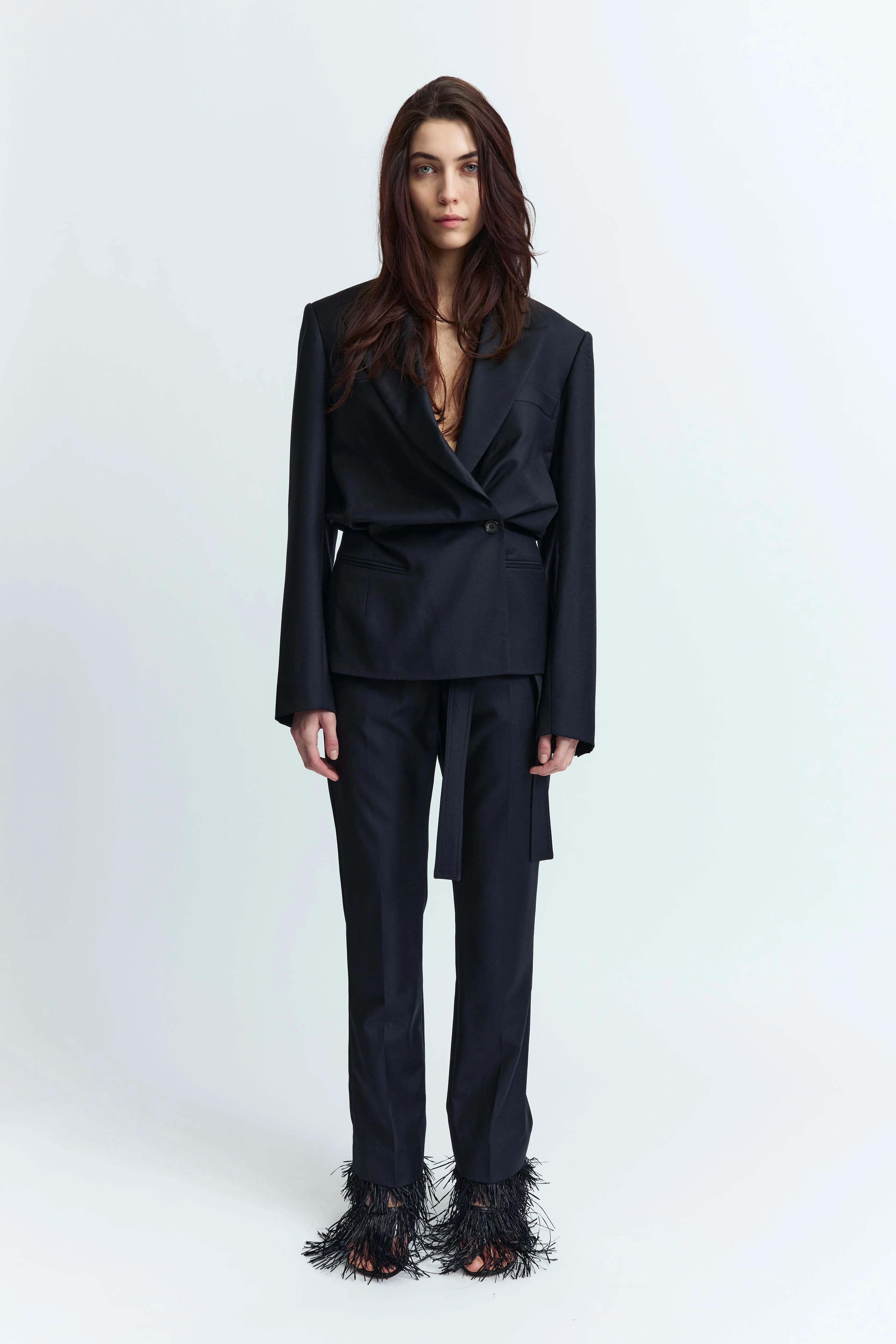 The Morena Jacket, crafted from lightweight virgin wool, is a collared blazer featuring gathered detailing at the waist for a cinched-in effect. It fastens at the waist with a single button and includes a breast pocket. Style it with the matching Maura Trouser for a complete head-to-toe look. MORE DETAILS Designed for a regular fit. The model is 5'9.5" (176cm) and wears a UK 8. - Outer: Virgin Wool 100% - Lining: Viscose 100% - Care: Specialist Dry Cleaning Only - Made in Portugal Style number: J-110-SS25-01