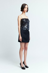 The Noelia Mini Skirt is a wrap style skirt that fastens with a button on the waist. It features a grey film sequin layer that peaks out from a slit in the skirt. It is designed to fit closely to the body and falls above the knees MORE DETAILS Designed for a regular fit. The model is 5'10.5" (178cm) and wears a UK 8. - Outer: 60% Polyester 23%, Virgin Wool 16% Viscose 1% Elastane - Contrast: 100% Polyester - Lining: 100% Viscose - Care: Hand wash only - Made in Portugal Style number: S-133-SS25-1