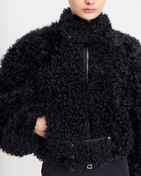 Nofre Jacket in black curly shearling features a cropped silhouette with softly rounded shoulders and a high collar that fastens perpendicular to the neck. A branded front zip is finished with a concealed clasp at the hem, while functional pockets complete the design. MORE DETAILS Designed for an oversized fit. The model is 5'11" (180cm) and wears a UK 8 - Main: 100% Lamb Shearling - Lining: 100% Polyester - Care: Dry cleaning only, iron a low temperature - Made in Great Britain Style number: J-129-AW25-01