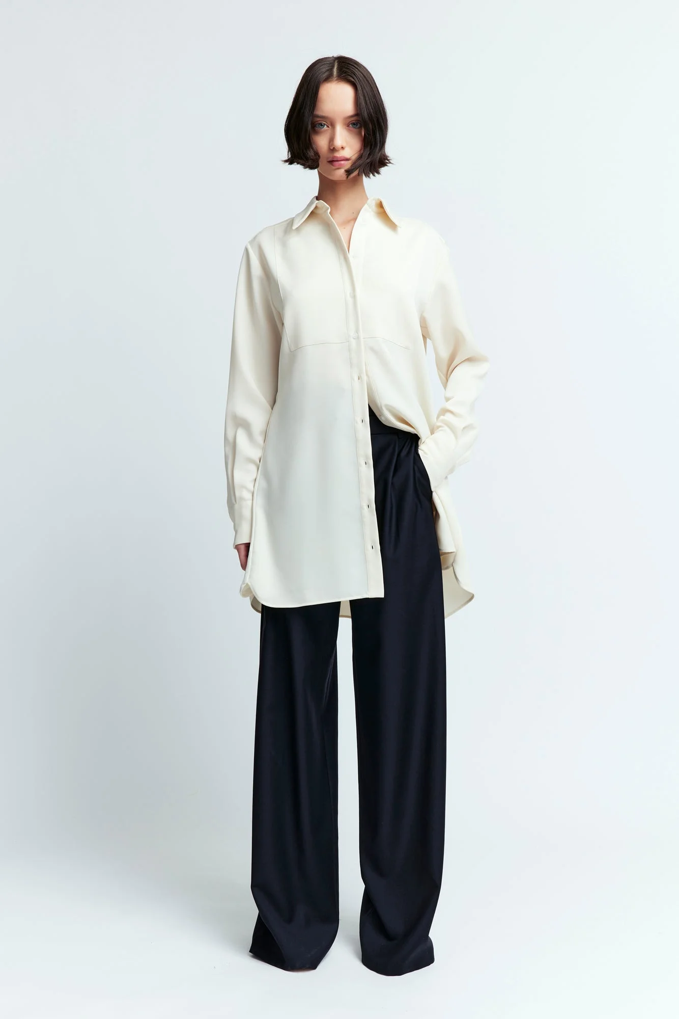 The Roga Mini Dress in off-white is a satin crepe shirt dress with a front button fastening. It features panel detailing at the bust and is finished with sleek satin cuffs. Designed for a relaxed fit, it falls above the knees. MORE DETAILS Designed for a relaxed fit. The model is 5'10.5" (178cm) and wears a UK 8. - Outer: 100% Polyester - Care: Dry Cleaning Only - Made in United Kingdom Style number: D-58-SS25-2