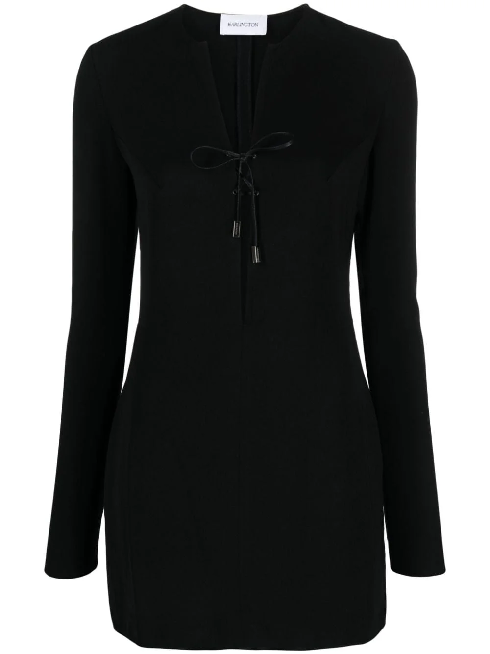 Seeran lace-up minidress Highlights - Black - Slim cut - Slash neck - Front lace-up fastening - Long sleeves - Straight hem Made in United Kingdom Composition Polyester 100% SIZE & FIT Model measurements Height 5 ft 10 in(1.78 m) Bust/Chest 32.67 in(83 cm) Hips 35.43 in(90 cm) Waist 23.22 in(59 cm) FittingInformation Designed for a close fit throughout Slightly short in length; consider your own measurements Made from a midweight non-stretch fabric, this piece offers minimal elasticity when worn This piece fits true to size – take your usual size Washing instructions Dry Clean Only