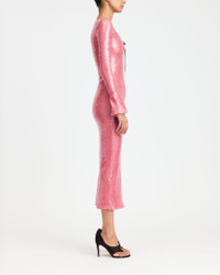 The Solaria dress is cut from subtle sheer sequin fabric in rose pink, lined with mesh for comfort and a gently cinched fit. Fitted through the body, it has long sleeves and a skirt that falls just below the knees. A cut-out at the neckline is laced with a branded metal-tipped cord, creating a functional, material accent. MORE DETAILS Designed for a slim fit. The model is 5'10" (178cm) and wears a UK 8. - Composition: Main:100% Polyester, Lining: 85% Nylon 15% Spandex - Care: Professional Dry Clean Only - Made in GREAT BRITAIN. Style number: D-MD-220-SS26-03
